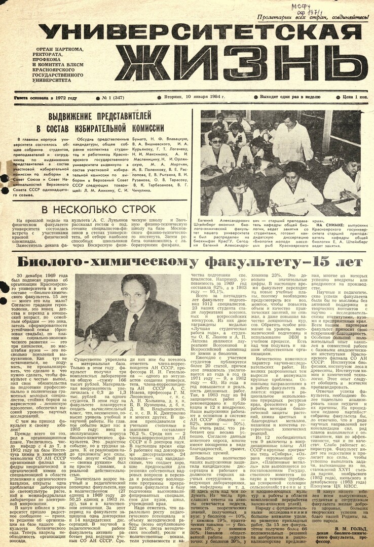 Библиографическое описание:Университетская жизнь : газета/ Красноярский государственный университет. - Красноярск : КрасГУ, 1972 - - 2006 1984г. N 1 (347) (10 января)