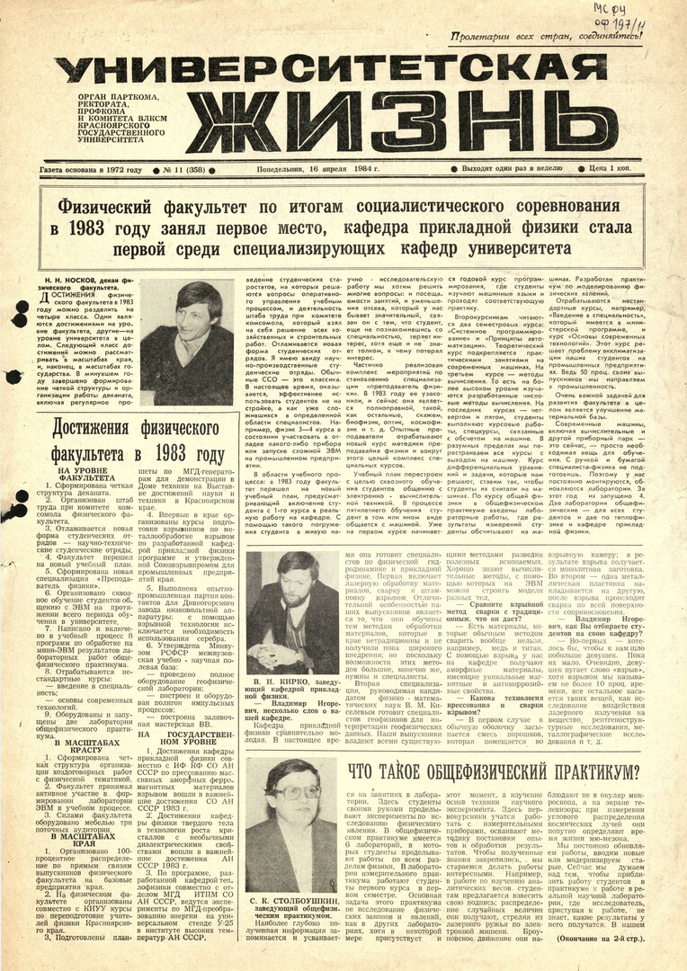 Университетская жизнь : газета/ Красноярский государственный университет. - Красноярск : КрасГУ, 1972 - - 2006 1984г. N 11 (358) (16 апреля) Полный текст ( 8.8 Мб; PDF). Ресурс свободного доступа