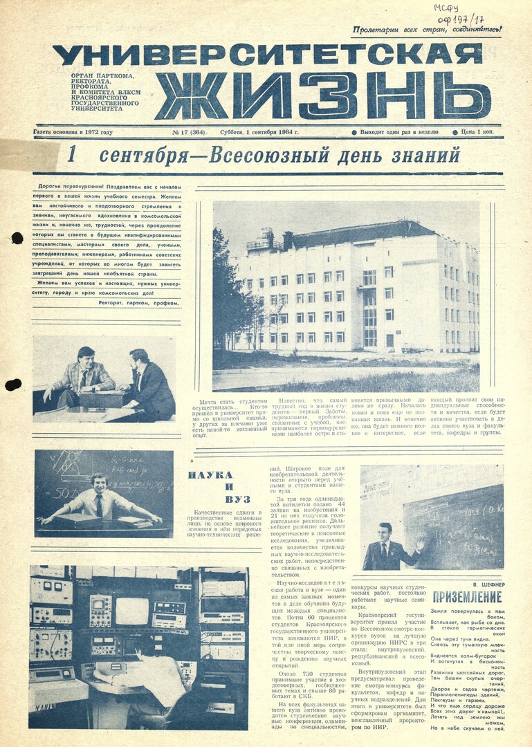 Университетская жизнь : газета/ Красноярский государственный университет. - Красноярск : КрасГУ, 1972 - - 2006 1984г. N 17 (364) (1 сентября) Полный текст ( 9.7 Мб; PDF). Ресурс свободного доступа