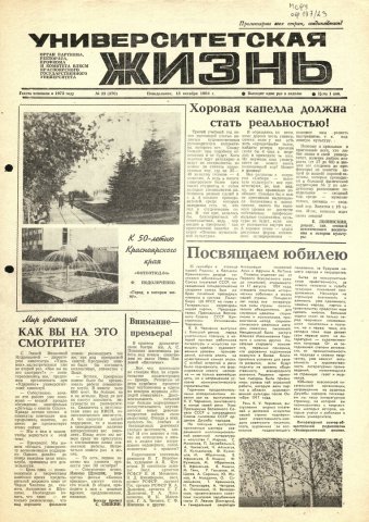 Университетская жизнь : газета/ Красноярский государственный университет. - Красноярск : КрасГУ, 1972 - - 2006 1984г. N 23 (370) (15 октября) Полный текст ( 9.3 Мб; PDF). Ресурс свободного доступа
