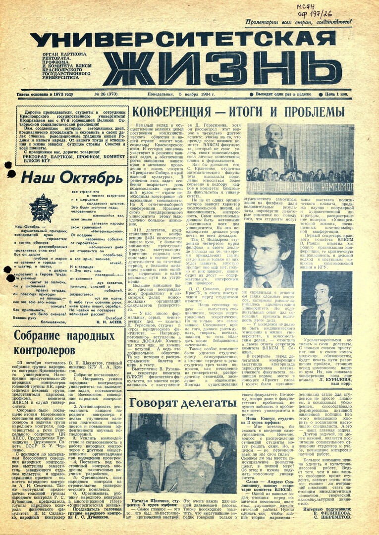 Университетская жизнь : газета/ Красноярский государственный университет. - Красноярск : КрасГУ, 1972 - - 2006 1984г. N 26 (373) (5 ноября) Полный текст ( 10.8 Мб; PDF). Ресурс свободного доступа