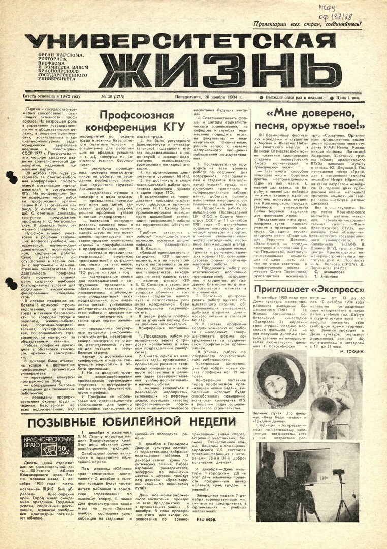 Университетская жизнь : газета / Красноярский государственный университет. - Красноярск : КрасГУ, 1972 - - 2006 1984г. N 28 (375) (26 ноября) Полный текст ( 9.5 Мб; PDF). Ресурс свободного доступа