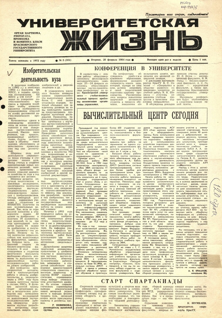 Университетская жизнь : газета/ Красноярский государственный университет. - Красноярск : КрасГУ, 1972 - - 2006 1984г. N 5 (351) (28 февраля) Полный текст ( 8.7 Мб; PDF). Ресурс свободного доступа