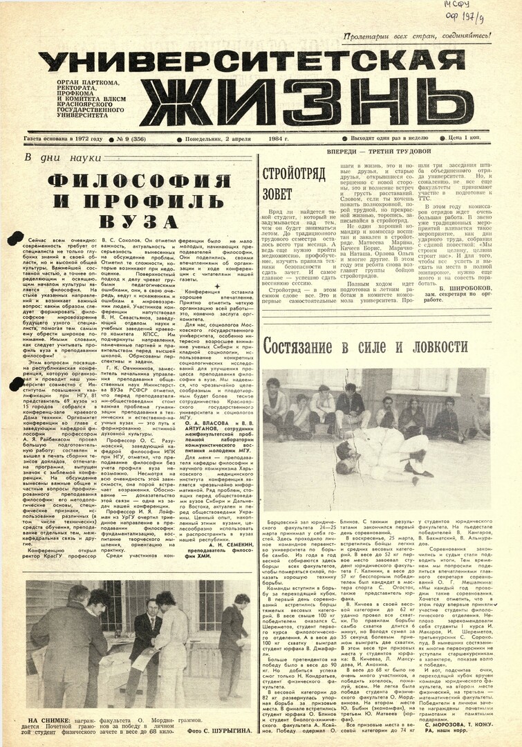 Университетская жизнь : газета/ Красноярский государственный университет. - Красноярск : КрасГУ, 1972 - - 2006 1984г. N 9 (356) (2 апреля) Полный текст ( 9.6 Мб; PDF). Ресурс свободного доступа