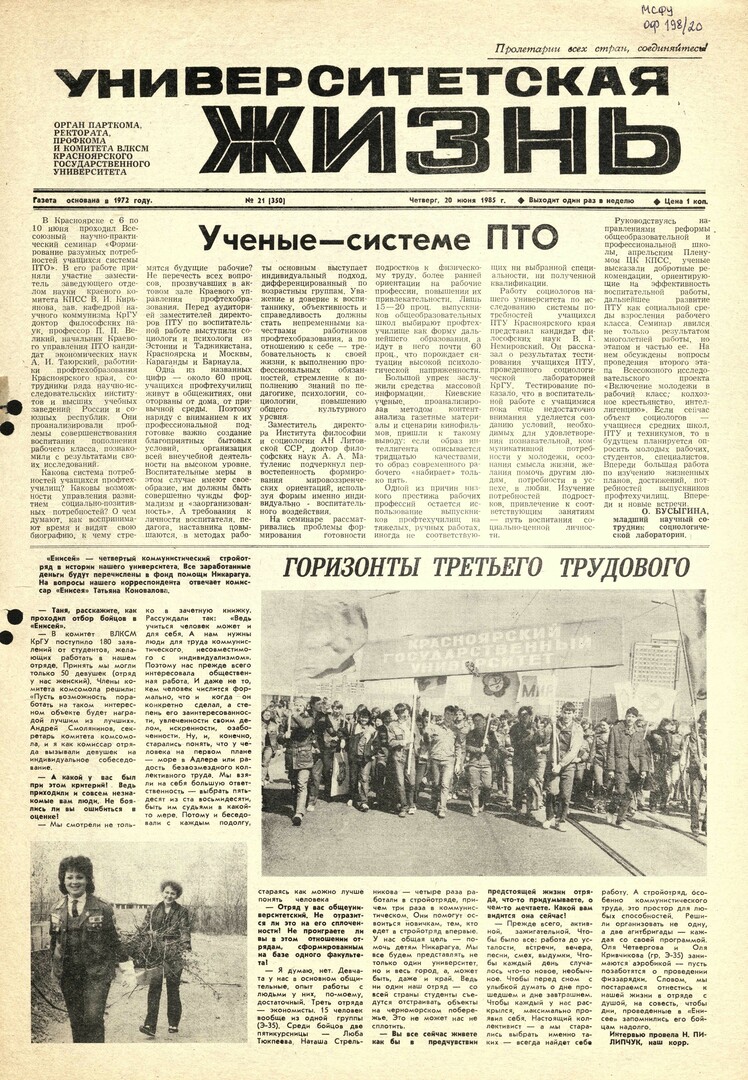 Университетская жизнь : газета/ Красноярский государственный университет. - Красноярск : КрасГУ, 1972 - - 2006 1985г. N 21 (350) (20 июня) Полный текст ( 7.0 Мб; PDF). Ресурс свободного доступа