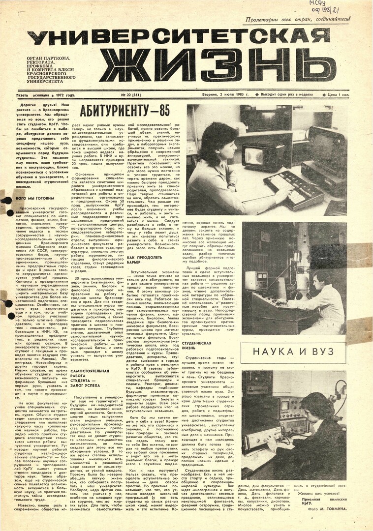 Университетская жизнь : газета/ Красноярский государственный университет. - Красноярск : КрасГУ, 1972 - - 2006 1985г. N 22 (351) (2 июля) Полный текст ( 6.8 Мб; PDF). Ресурс свободного доступа