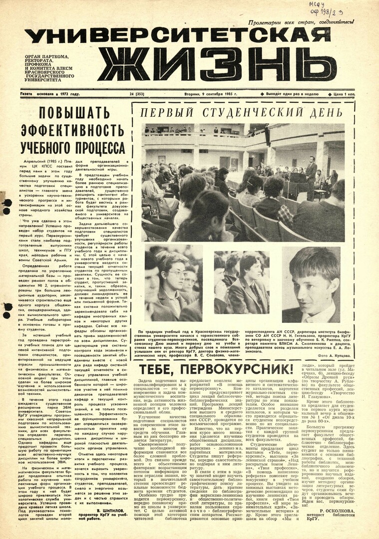 Университетская жизнь : газета/ Красноярский государственный университет. - Красноярск : КрасГУ, 1972 - - 2006 1985г. N 24 (353) (9 сентября) Полный текст ( 7.3 Мб; PDF). Ресурс свободного доступа