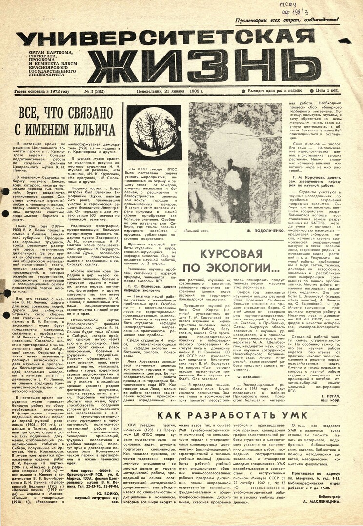 Университетская жизнь : газета / Красноярский государственный университет. - Красноярск : КрасГУ, 1972 - - 2006 1985г. N 3 (382) (21 января) Полный текст ( 6.4 Мб; PDF). Ресурс свободного доступа
