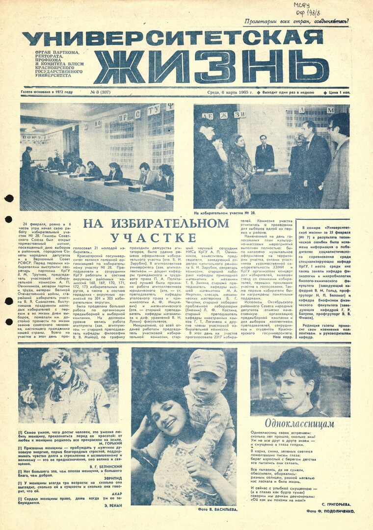 Университетская жизнь : газета/ Красноярский государственный университет. - Красноярск : КрасГУ, 1972 - - 2006 1985г. N 8 (387) (6 марта) Полный текст ( 7.1 Мб; PDF). Ресурс свободного доступа