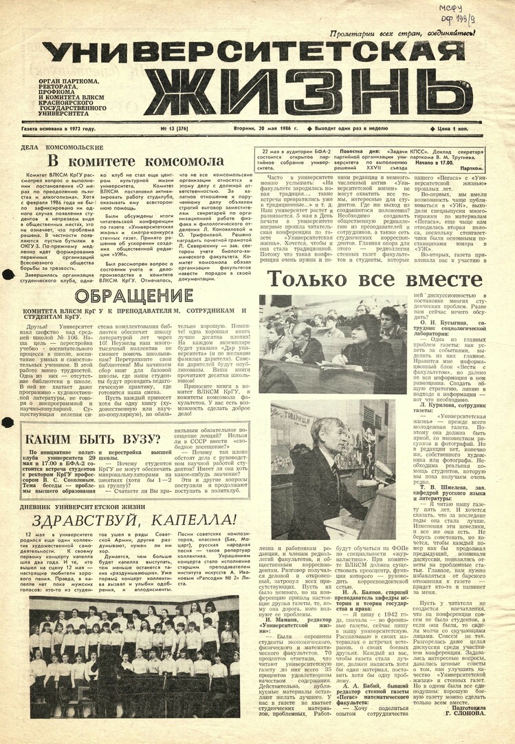 Университетская жизнь : газета/ Красноярский государственный университет. - Красноярск : КрасГУ, 1972 - - 2006 1986г. N 13 (376) (20 мая) Полный текст ( 7.1 Мб; PDF). Ресурс свободного доступа