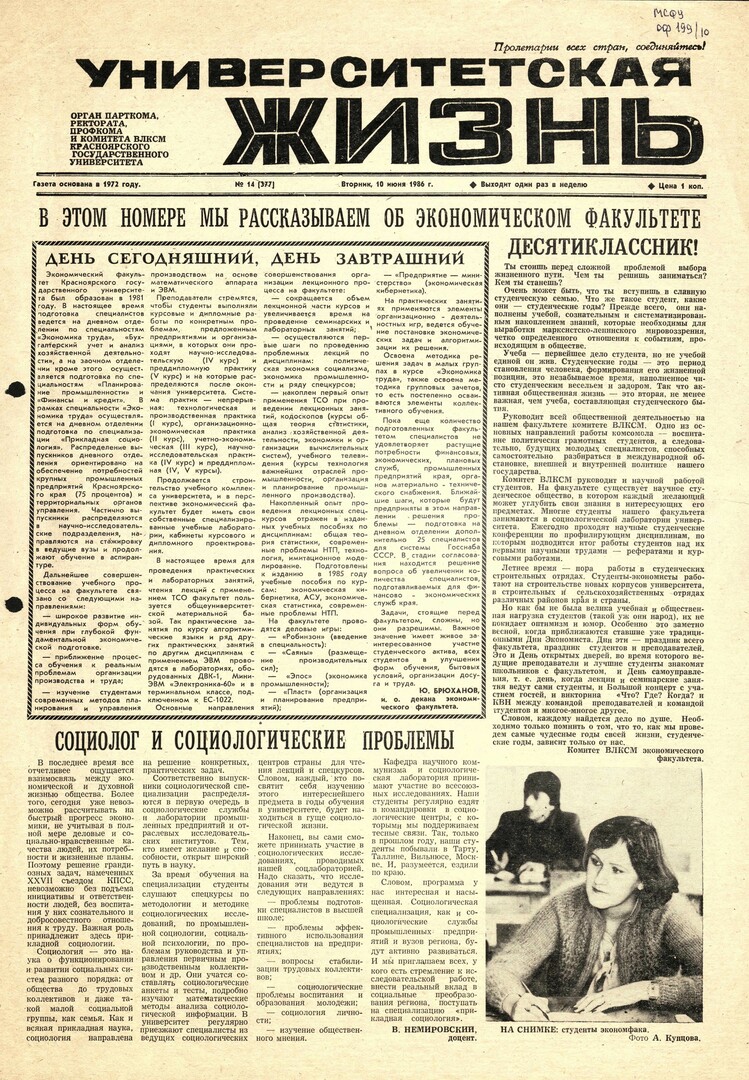 Университетская жизнь : газета/ Красноярский государственный университет. - Красноярск : КрасГУ, 1972 - - 2006 1986г. N 14 (377) (10 июня) Полный текст ( 6.5 Мб; PDF). Ресурс свободного доступа