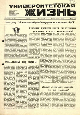 Университетская жизнь : газета/ Красноярский государственный университет. - Красноярск : КрасГУ, 1972 - - 2006 1986г. N 17 (380) (14 октября) Полный текст ( 6.0 Мб; PDF). Ресурс свободного доступа