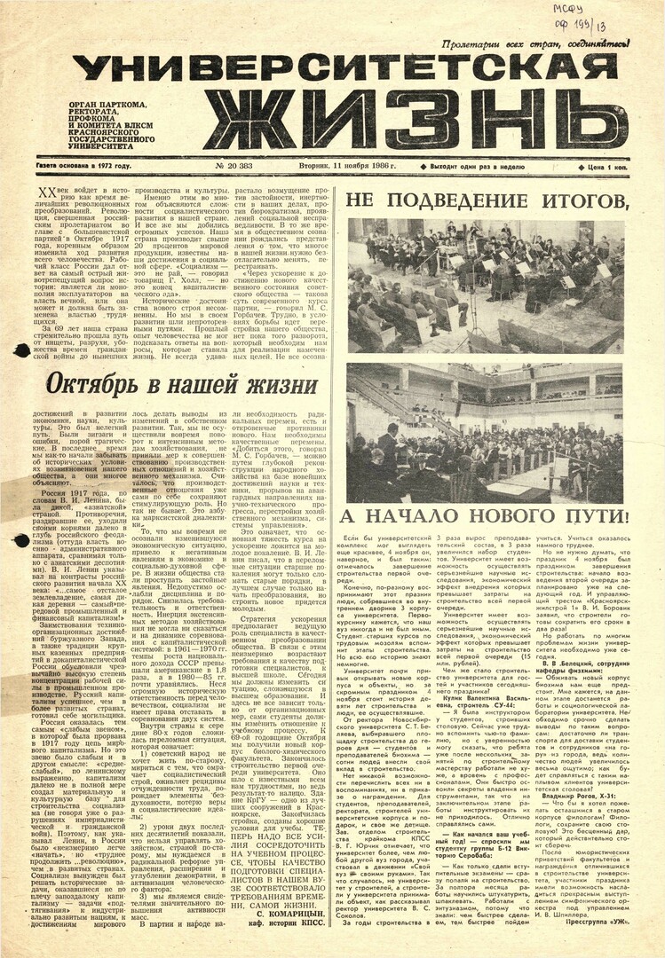 Университетская жизнь : газета. 1986 г. № 20 (383) (11 ноября)