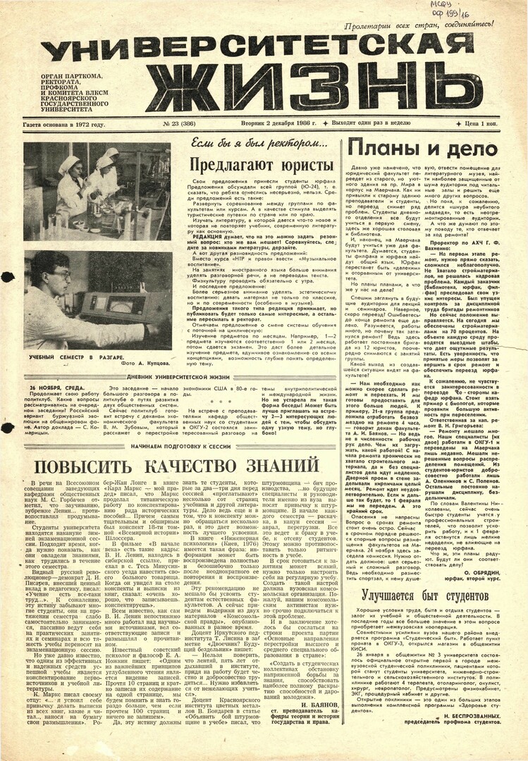 Университетская жизнь : газета/ Красноярский государственный университет. - Красноярск : КрасГУ, 1972 - - 2006 1986г. N 23 (386) (2 декабря) Полный текст ( 6.7 Мб; PDF). Ресурс свободного доступа