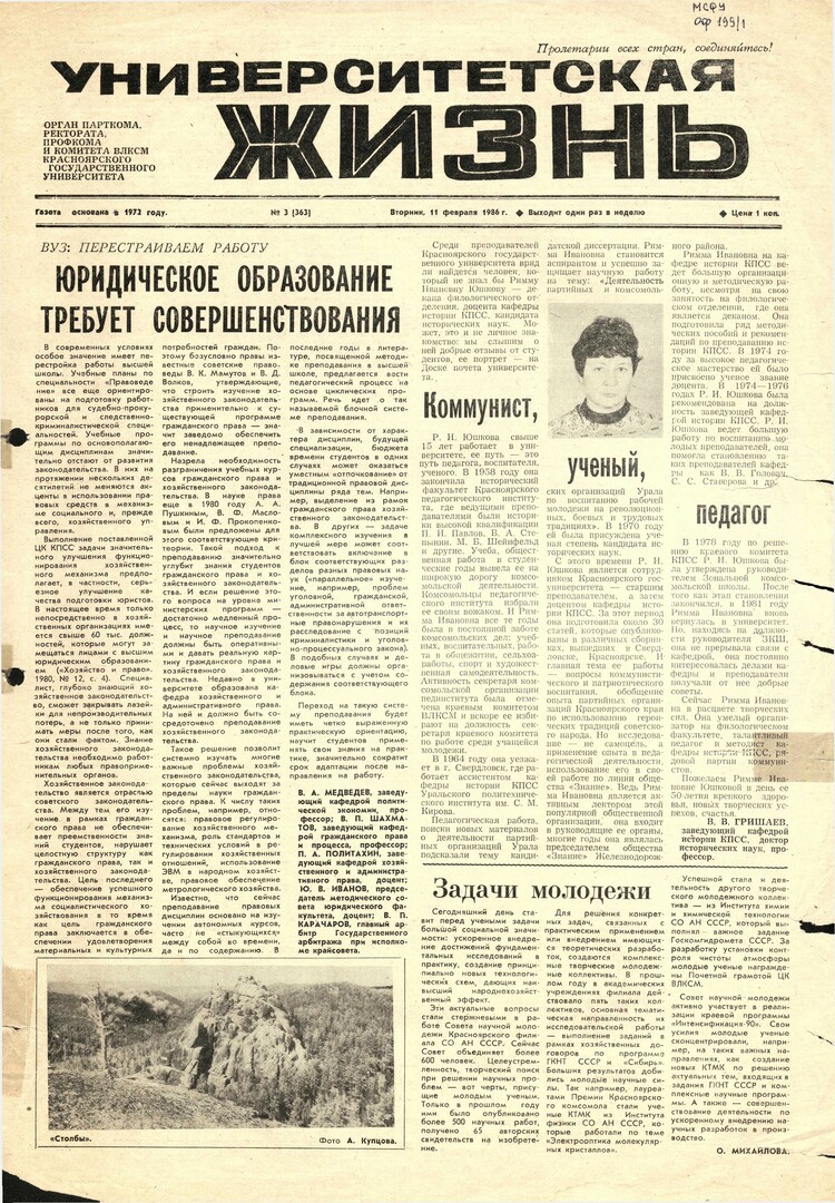 Университетская жизнь : газета/ Красноярский государственный университет. - Красноярск : КрасГУ, 1972 - - 2006 1986г. N 3 (363) (11 февраля) Полный текст ( 6.3 Мб; PDF). Ресурс свободного доступа
