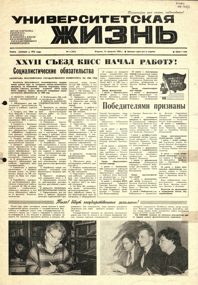 Университетская жизнь : газета/ Красноярский государственный университет. - Красноярск : КрасГУ, 1972 - - 2006 1986г. N 4 (367) (25 февраля) Полный текст ( 6.7 Мб; PDF). Ресурс свободного доступа