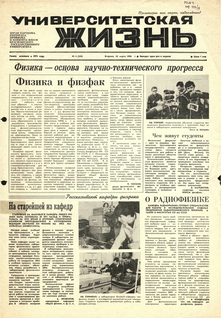 Университетская жизнь : газета / Красноярский государственный университет. - Красноярск : КрасГУ, 1972 - - 2006 1986г. N 6 (369) (18 марта) Полный текст ( 6.6 Мб; PDF). Ресурс свободного доступа