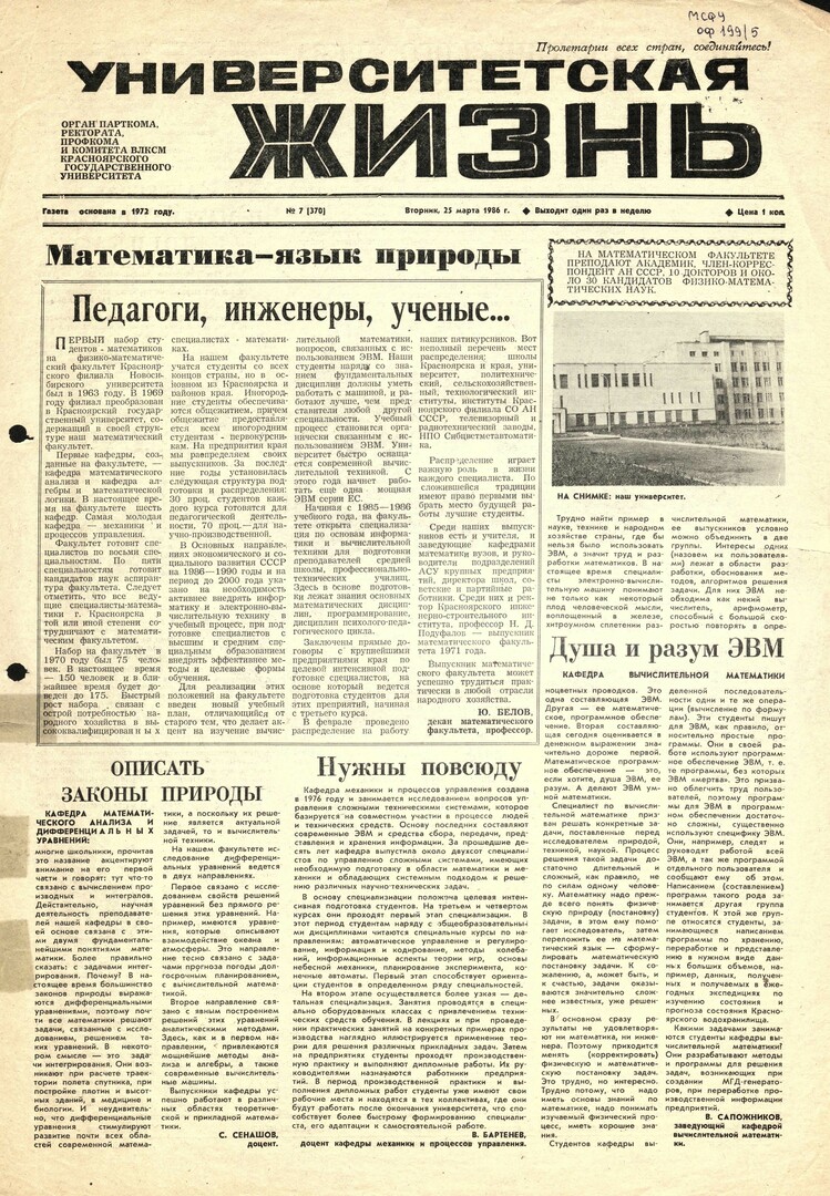 Университетская жизнь : газета/ Красноярский государственный университет. - Красноярск : КрасГУ, 1972 - - 2006 1986г. N 7 (370) (25 марта) Полный текст ( 6.8 Мб; PDF). Ресурс свободного доступа