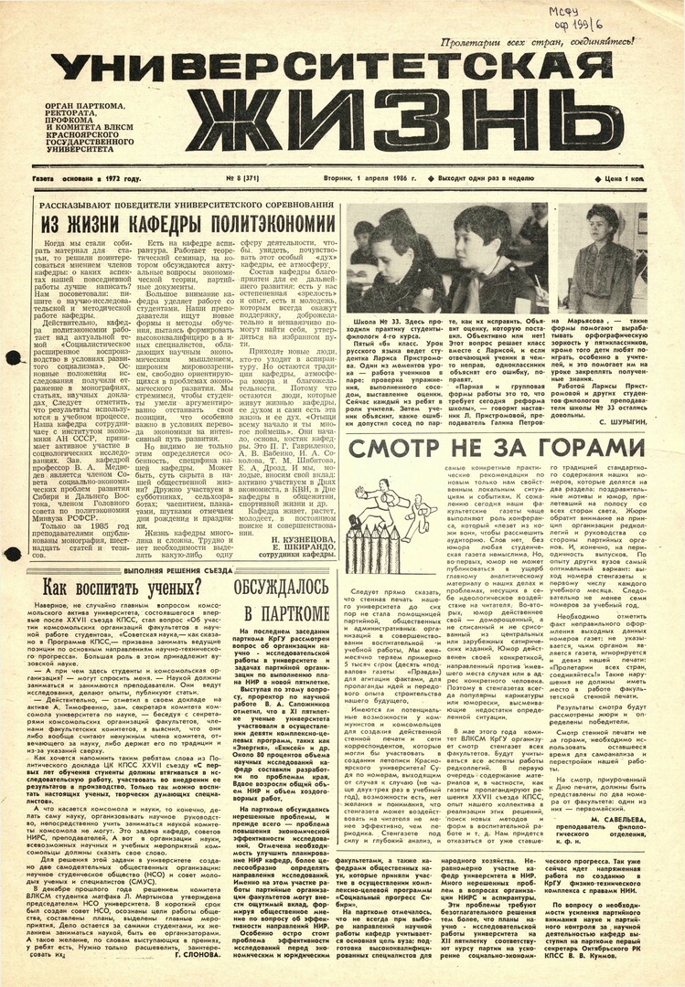 Университетская жизнь : газета/ Красноярский государственный университет. - Красноярск : КрасГУ, 1972 - - 2006 1986г. N 8 (371) (1 апреля) Полный текст ( 6.5 Мб; PDF). Ресурс свободного доступа