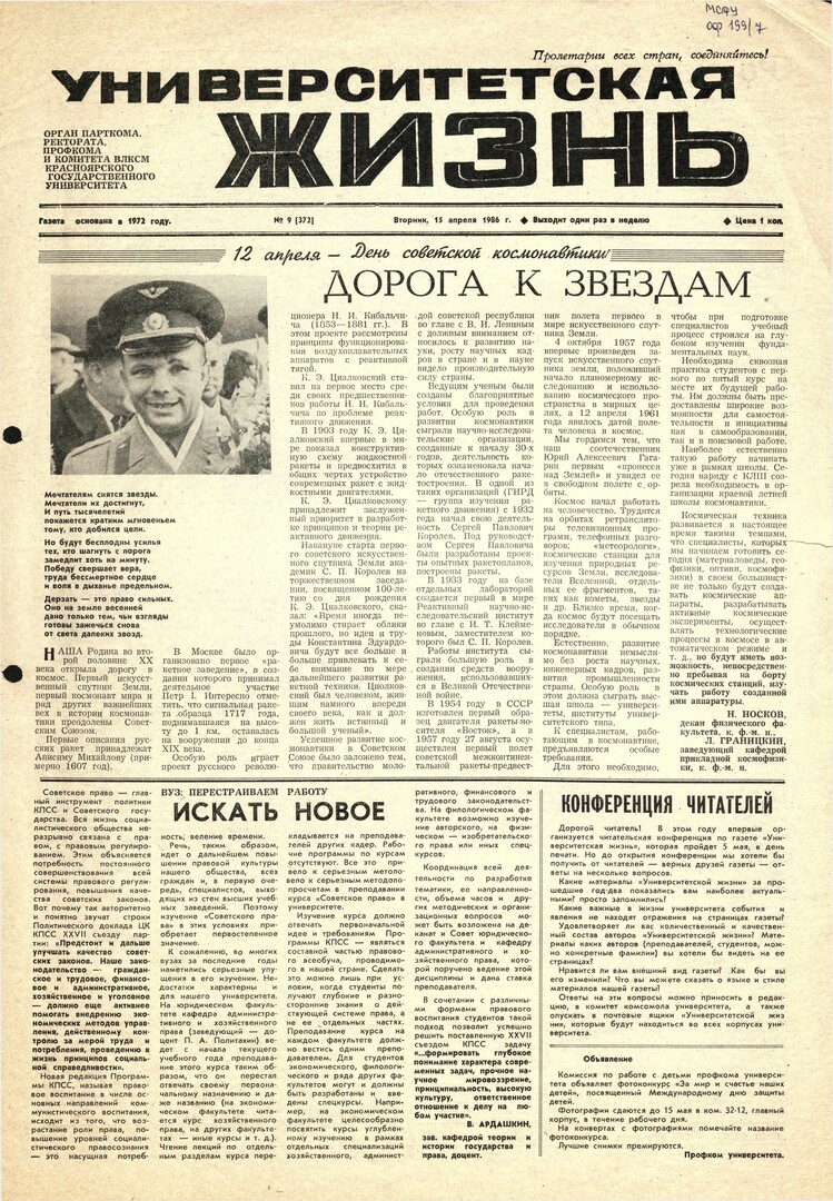 Университетская жизнь : газета/ Красноярский государственный университет. - Красноярск : КрасГУ, 1972 - - 2006 1986г. N 9 (372) (15 апреля) Полный текст ( 6.2 Мб; PDF). Ресурс свободного доступа