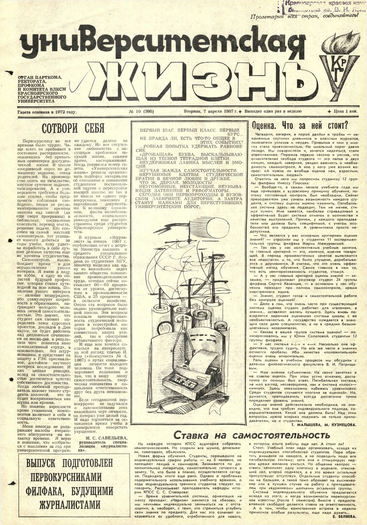 Библиографическое описание:Университетская жизнь : газета/ Красноярский государственный университет. - Красноярск : КрасГУ, 1972 - - 2006 1987г. N 10 (398) (7 апреля)