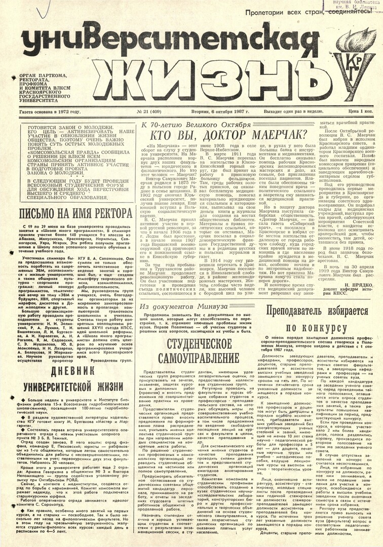 Библиографическое описание:Университетская жизнь : газета/ Красноярский государственный университет. - Красноярск : КрасГУ, 1972 - - 2006 1987г. N 21 (409) (6 октября)