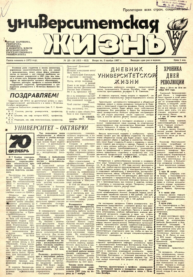 Библиографическое описание:Университетская жизнь : газета/ Красноярский государственный университет. - Красноярск : КрасГУ, 1972 - - 2006 1987г. N 23/24 (411-412) (3 ноября)