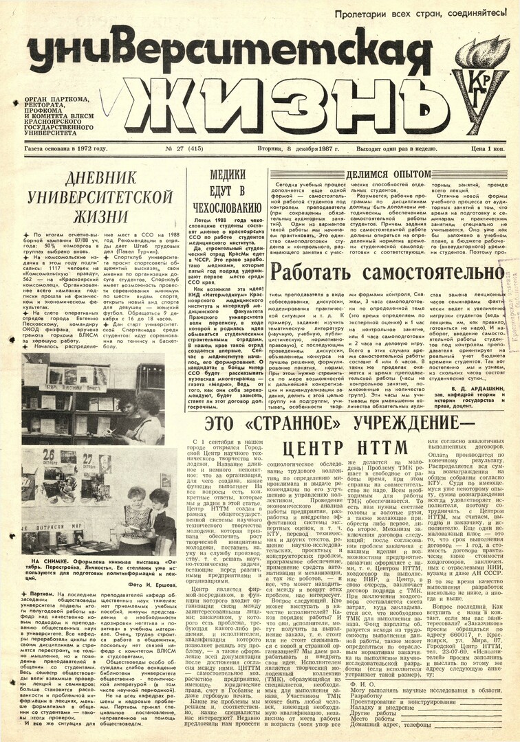 Библиографическое описание:Университетская жизнь : газета/ Красноярский государственный университет. - Красноярск : КрасГУ, 1972 - - 2006 1987г. N 27 (415) (8 декабря)