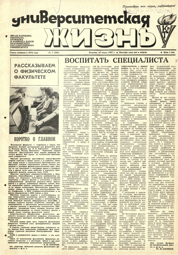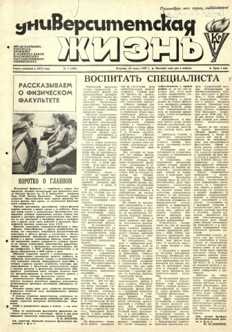 Библиографическое описание:Университетская жизнь : газета/ Красноярский государственный университет. - Красноярск : КрасГУ, 1972 - - 2006 1987г. N 7 (395) (10 марта)