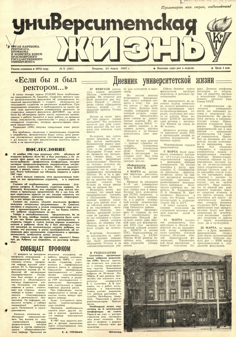 Библиографическое описание:Университетская жизнь : газета/ Красноярский государственный университет. - Красноярск : КрасГУ, 1972 - - 2006 1987г. N 9 (397) (24 марта)