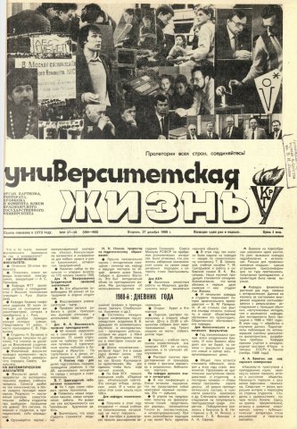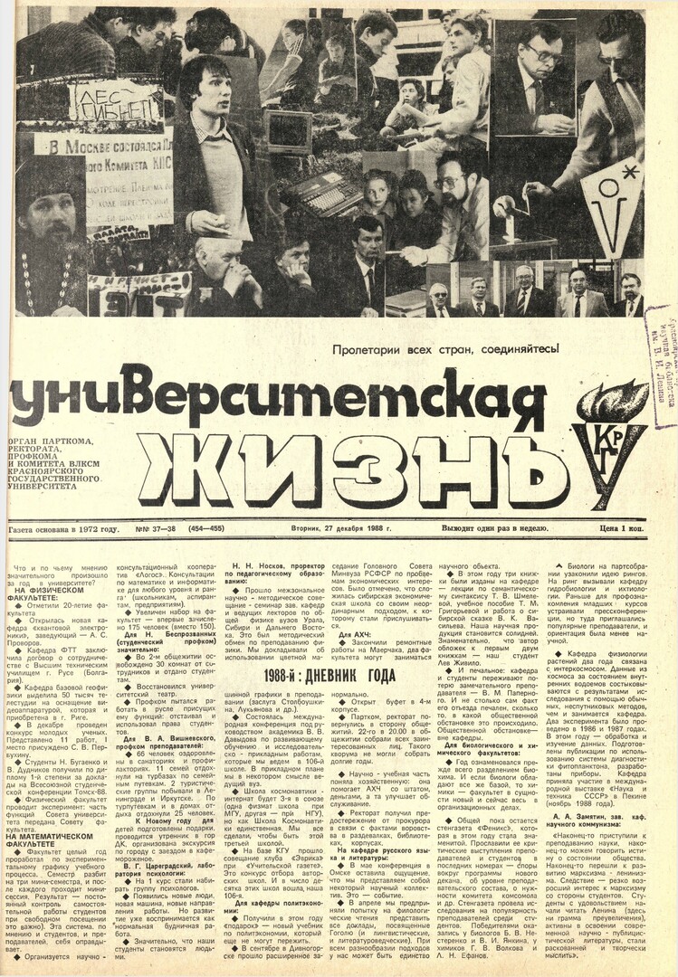 Библиографическое описание:Университетская жизнь : газета / Красноярский государственный университет. - Красноярск : КрасГУ, 1972 - - 2006 1988г. N 37/38 (454-455) (27 декабря)