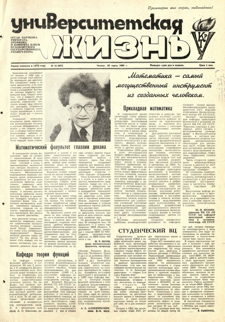 Библиографическое описание:Университетская жизнь : газета/ Красноярский государственный университет. - Красноярск : КрасГУ, 1972 - - 2006 1989г. N 12 (467) (30 марта)