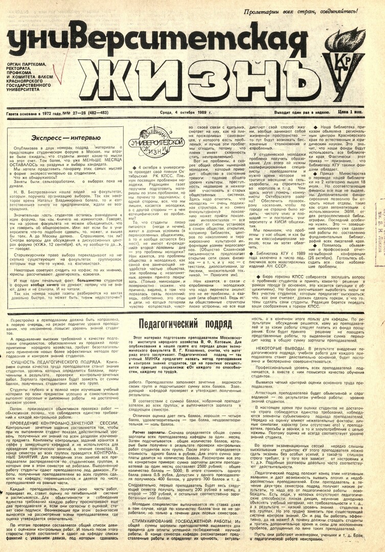 Библиографическое описание:Университетская жизнь : газета/ Красноярский государственный университет. - Красноярск : КрасГУ, 1972 - - 2006 1989г. N 27/28 (482-483) (4 октября)