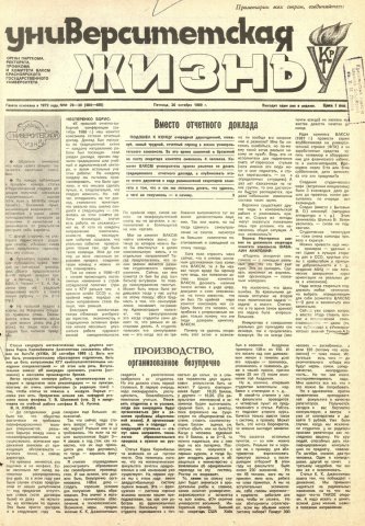 Библиографическое описание:Университетская жизнь : газета/ Красноярский государственный университет. - Красноярск : КрасГУ, 1972 - - 2006 1989г. N 29/30 (484-485) (20 октября)