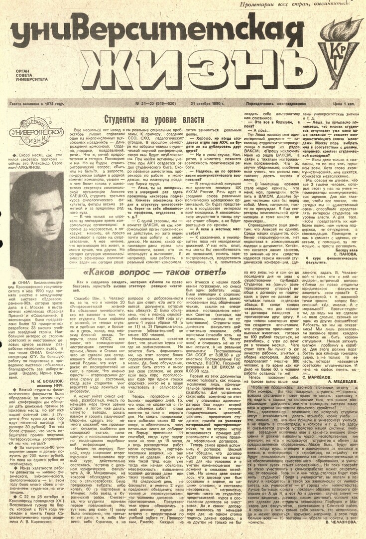Университетская жизнь : газета/ Красноярский государственный университет. - Красноярск : КрасГУ, 1972 - - 2006 1990г. N 21/22 (519-520) (31 октября) Полный текст ( 18.6 Мб; PDF). Ресурс свободного доступа