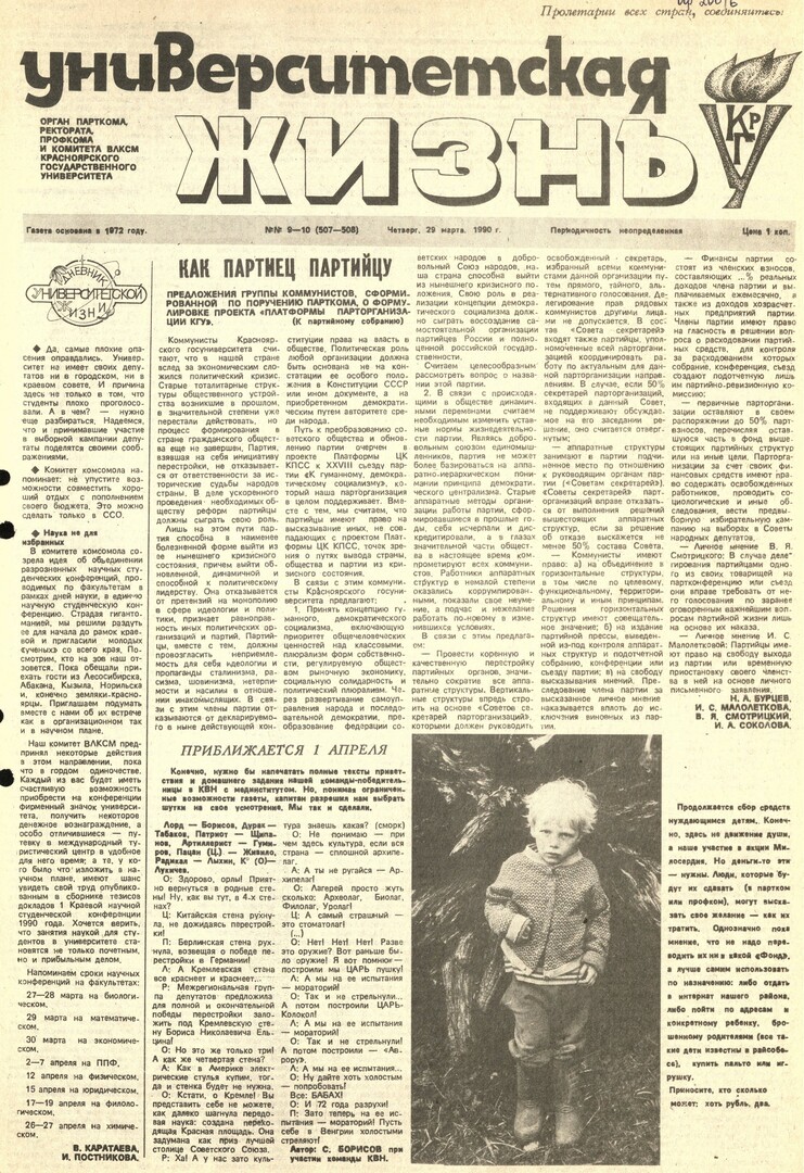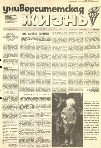 Университетская жизнь : газета/ Красноярский государственный университет. - Красноярск : КрасГУ, 1972 - - 2006 1990г. N 9/10 (507-508) (29 марта) Полный текст ( 18.2 Мб; PDF). Ресурс свободного доступа