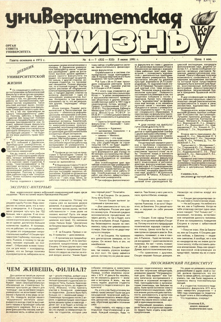 Университетская жизнь : газета/ Красноярский государственный университет. - Красноярск : КрасГУ, 1972 - - 2006 1991г. N 6/7 (532-533) (5 июня) Полный текст ( 17.0 Мб; PDF). Ресурс свободного доступа