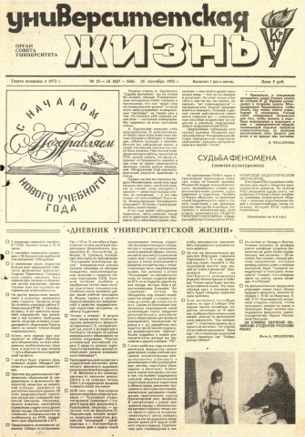 Университетская жизнь : газета. 1992 г. № 15/16 (567-568) (25 сентября)