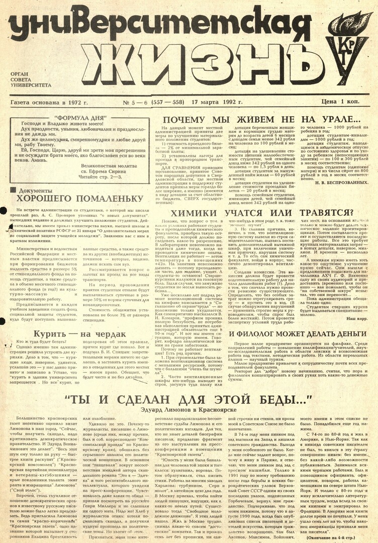 Университетская жизнь : газета/ Красноярский государственный университет. - Красноярск : КрасГУ, 1972 - - 2006 1992г. N 5/6 (557-558) (17 марта) Полный текст ( 17.9 Мб; PDF). Ресурс свободного доступа