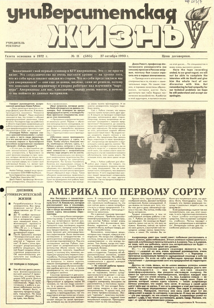 Университетская жизнь : газета. 1993 г. № 11 (585) (27 октября)выпуск журнала/газеты