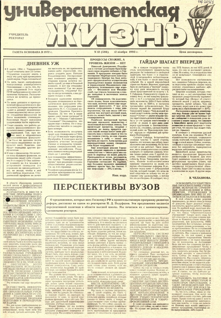 Университетская жизнь : газета. 1993 г. № 12 (586) (12 ноября)