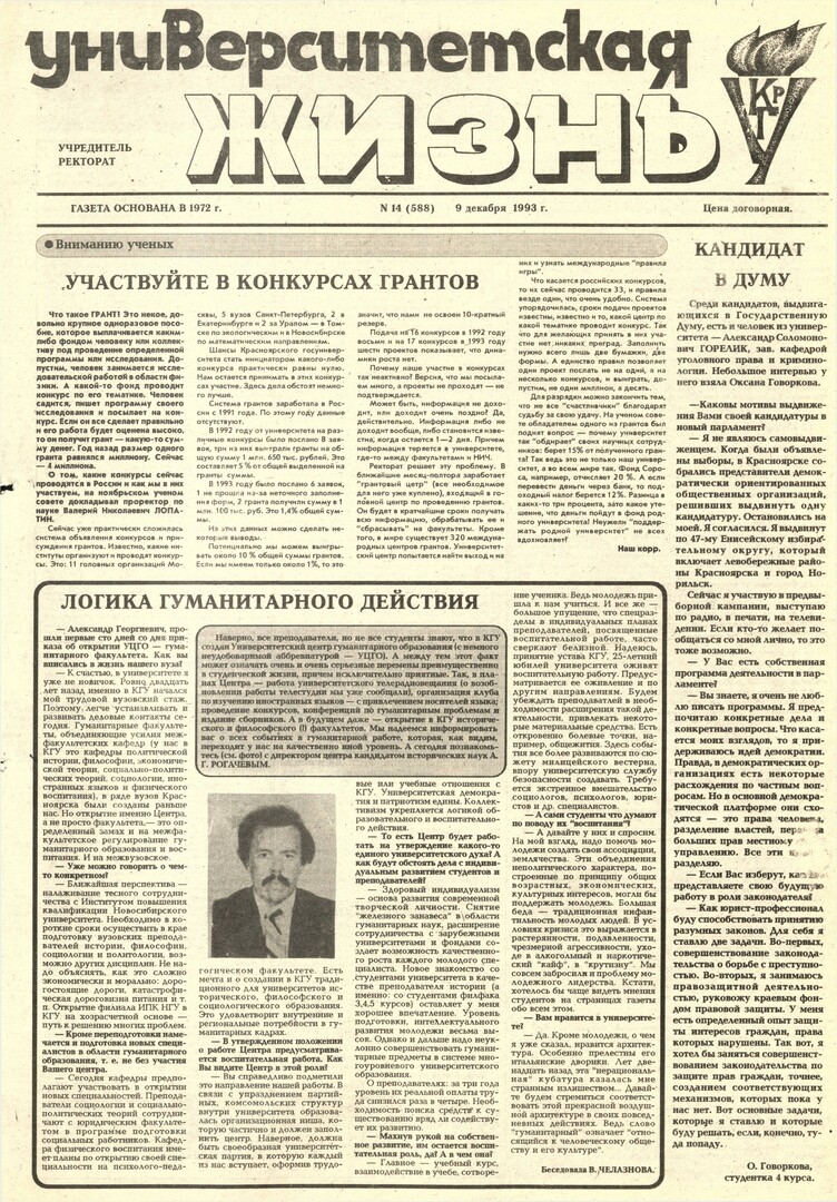 Университетская жизнь : газета/ Красноярский государственный университет. - Красноярск : КрасГУ, 1972 - - 2006 1993г. N 14 (588) (9 декабря) Полный текст ( 18.2 Мб; PDF). Ресурс свободного доступа