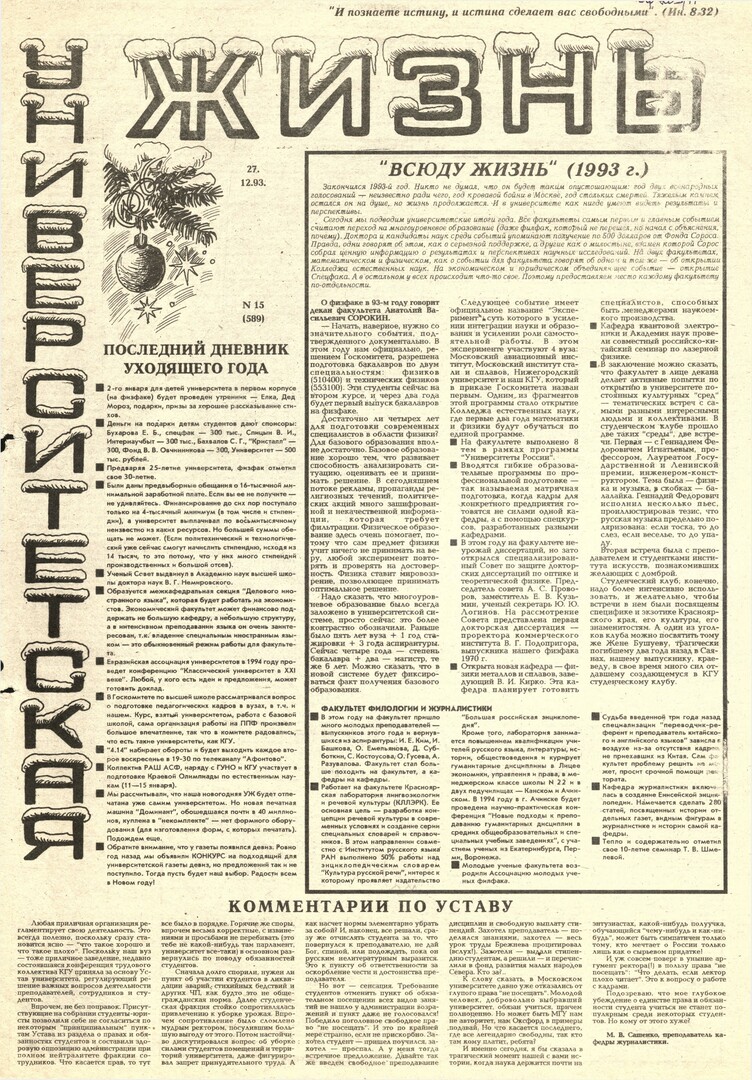 Университетская жизнь : газета. 1993 г. № 15 (589) (27 декабря)