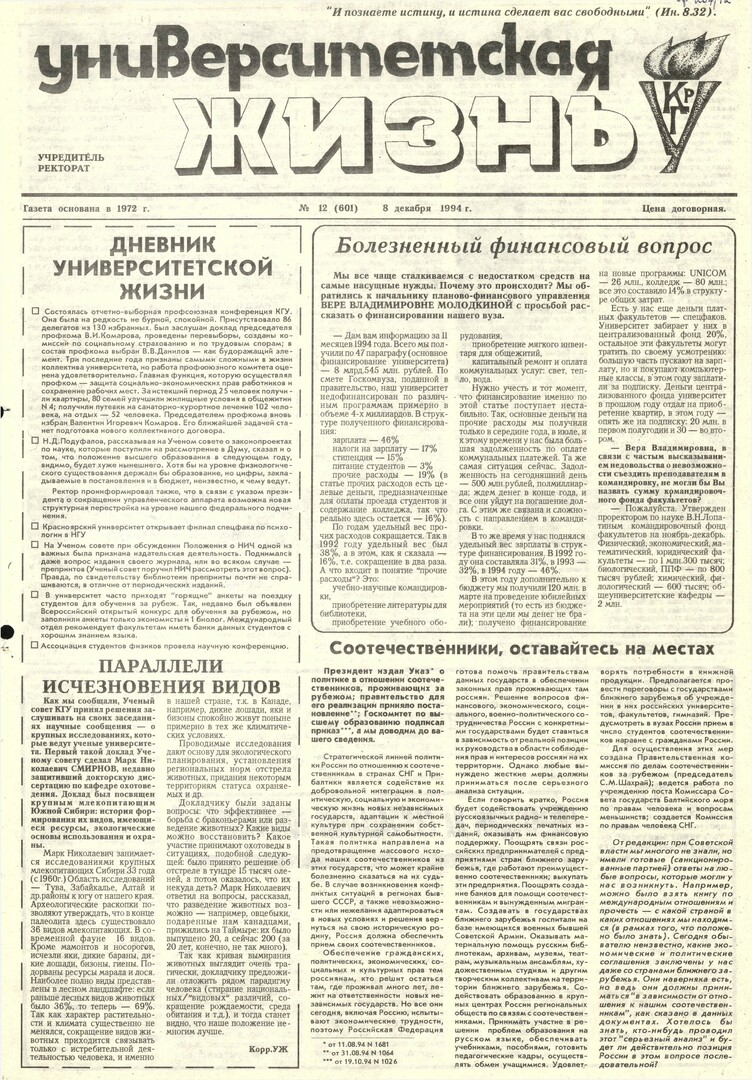 Университетская жизнь : газета. 1994 г. № 12 (601) (8 декабря)