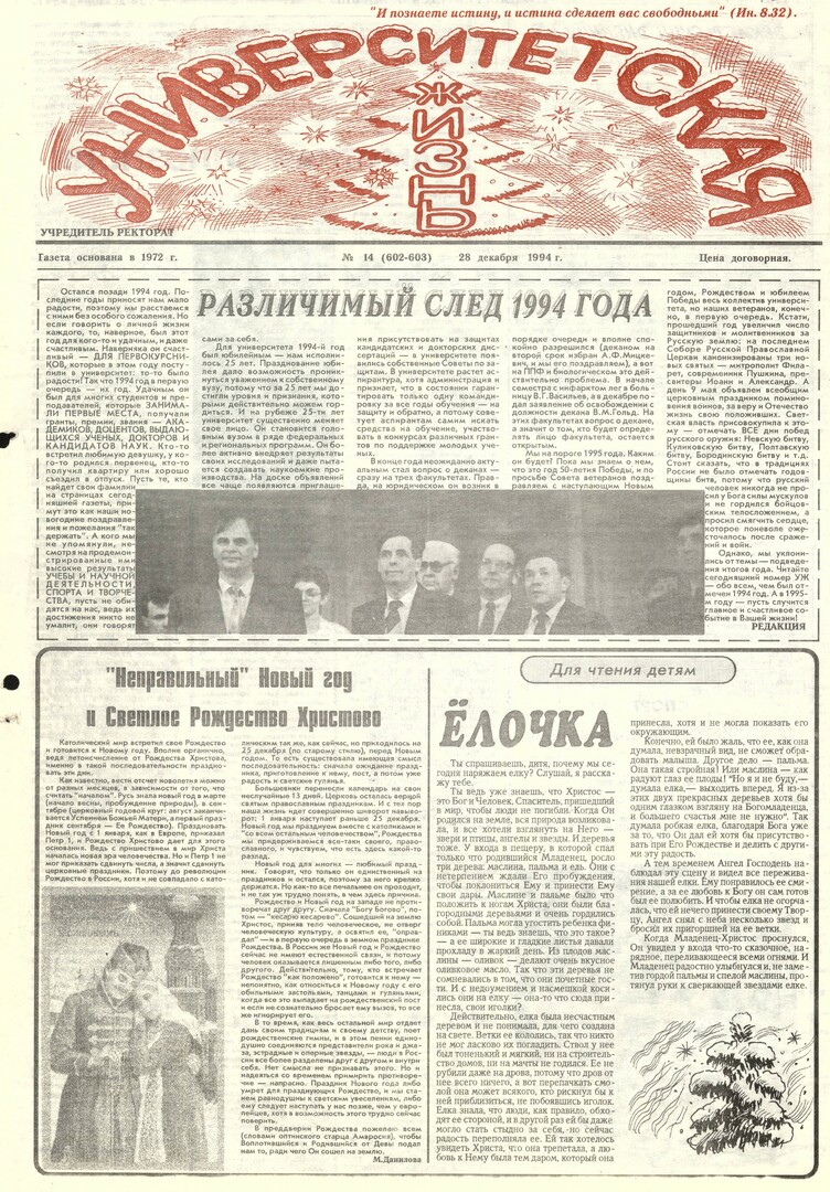 Университетская жизнь : газета. 1994 г. № 13/14 (602-603) (28 декабря)