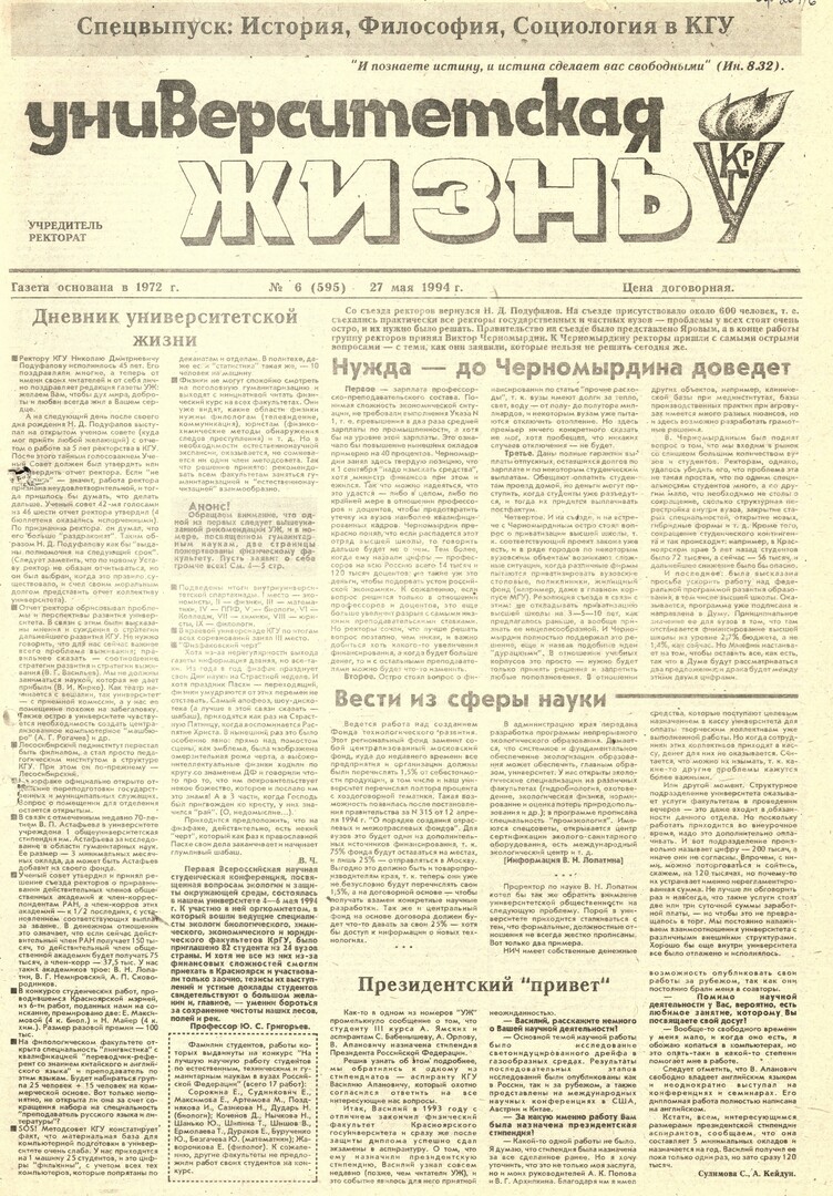Университетская жизнь : газета/ Красноярский государственный университет. - Красноярск : КрасГУ, 1972 - - 2006 1994г. N 6 (595) (27 мая) Полный текст ( 37.8 Мб; PDF). Ресурс свободного доступа