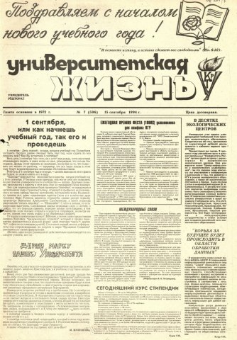 Университетская жизнь : газета. 1994 г. № 7 (596) (15 сентября)