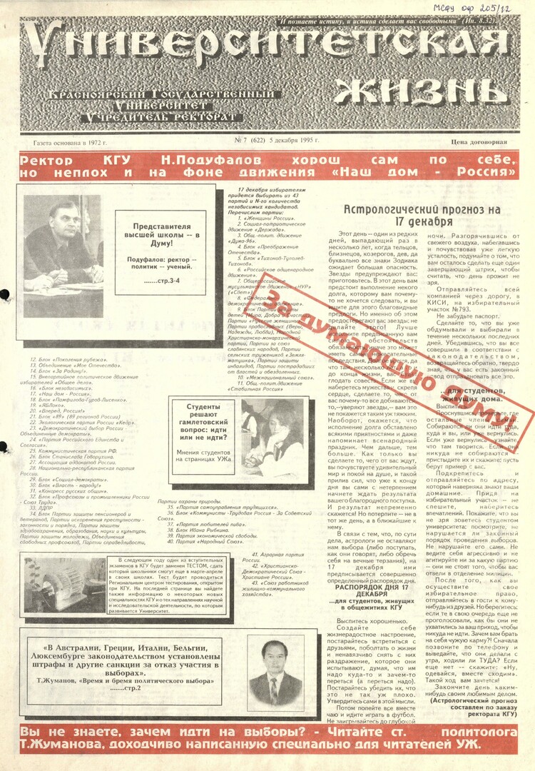Университетская жизнь : газета/ Красноярский государственный университет. - Красноярск : КрасГУ, 1972 - - 2006 1995г. N 7* (622) (5 декабря) Полный текст ( 24.0 Мб; PDF). Ресурс свободного доступа