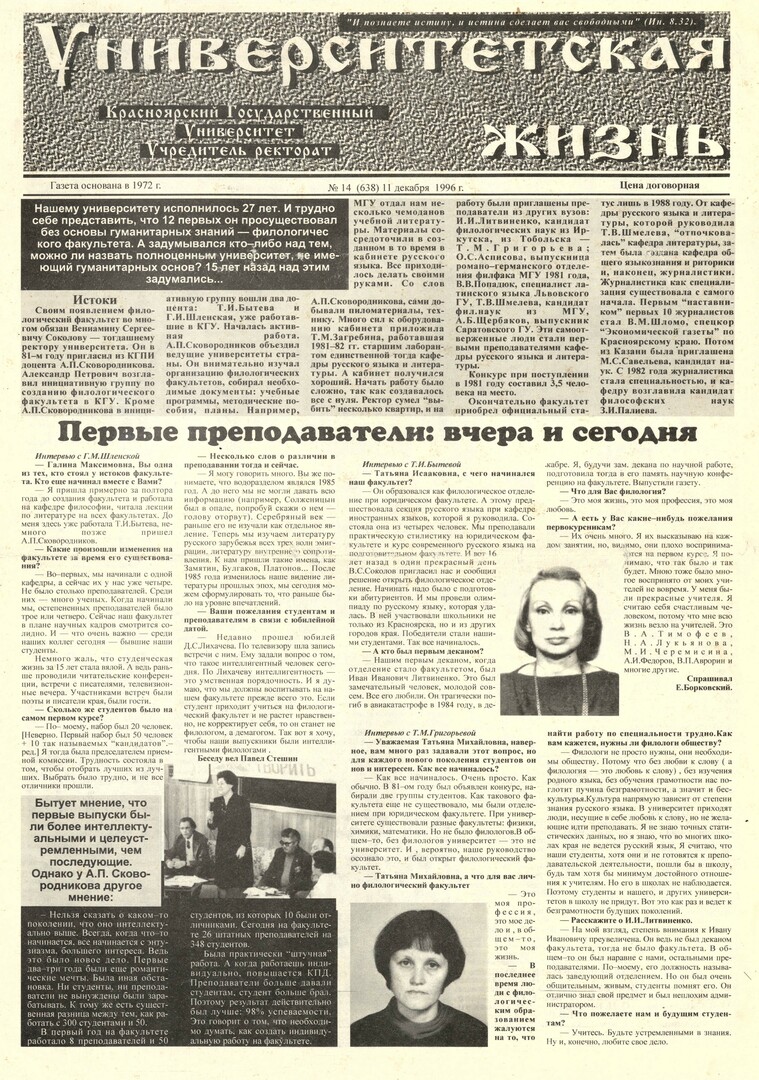 Университетская жизнь : газета/ Красноярский государственный университет. - Красноярск : КрасГУ, 1972 - - 2006 1996г. N 14 (638) (11 декабря) Полный текст ( 28.2 Мб; PDF). Ресурс свободного доступа
