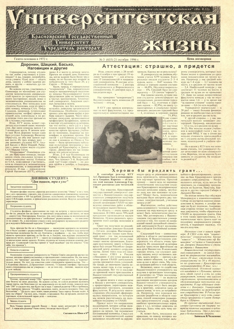 Университетская жизнь : газета/ Красноярский государственный университет. - Красноярск : КрасГУ, 1972 - - 2006 1996г. N 3* (635) (21 октября) Полный текст ( 17.0 Мб; PDF). Ресурс свободного доступа
